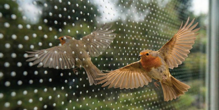 Patterned coating that makes the glass visible to birds by reflecting in the ultraviolet spectrum, while maintaining clarity for people.